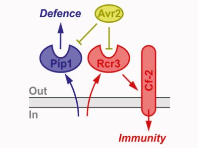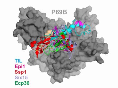 A collaboration with the laboratory of Sophien Kamoun (Sainsbury lab, Norwich, UK) resulted in the discovery of the molecular details of host adaptation of a Phytophthora infestans lineage that jumped onto a different host species about 1300 years ago. The protease content of this new host species is different, which forced the pathogen to adapt its protease inhibitors. A single amino acid residue exchange underpins host adaptation and is associated with a reduced ability to manipulate the proteases from the former host. Published in Science. Comments published in Science, The Scientist, and Oxford Media.